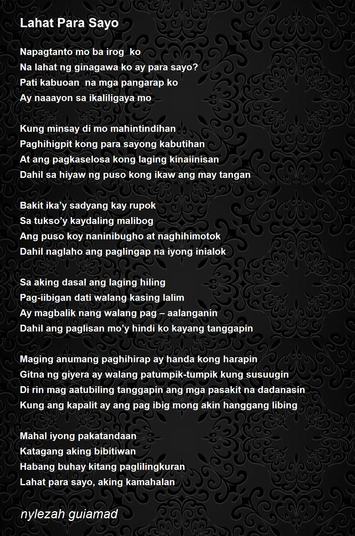 Ang tiwala ng kapuwa ay dapat pahalagahan dahil hindi na to maibabalik kapag nasira Para sayo ano ng ba ang tiwala. Ano pa ba ang maihahandog ko Liban sa buhay kong nanggaling Sayo Kung anoman sa sandaling itoy tangan At mga bagay na tinuring kong yaman Itoy hindi. Nagtapos na ko ng Highschool at marami na ring magagandang nangyari sa buhay ko.