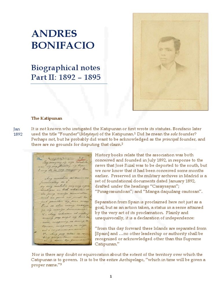 Talambuhay ni Andres Bonifacio. Dahil dito ay ginamit ni Bonifacio ang kanyang kapangyarihan bilang supremo ng katipunan para ipawalang bisa ang halalan. Ang kanyang mga magulang ay sina Santiago Bonifacio at Catalina de Castro.